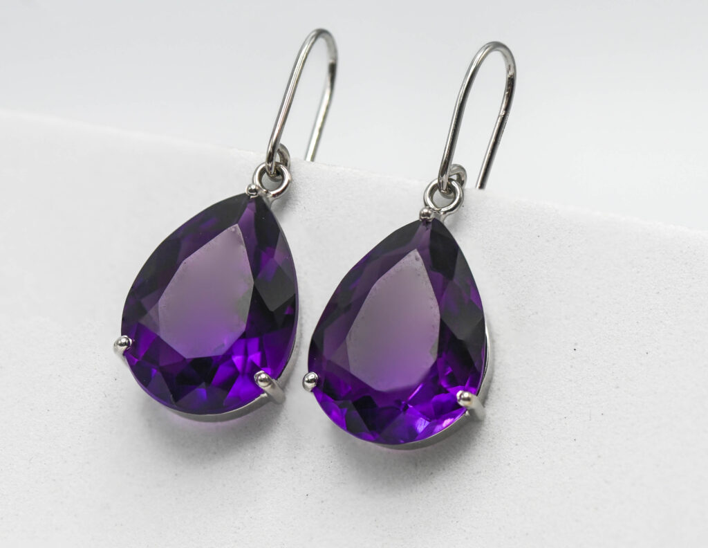 SOLD A pair 14ct amethyst drop earrings set white gold.
