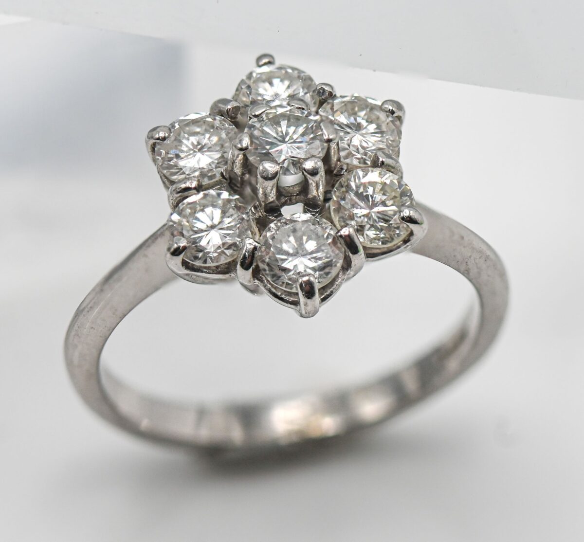 A beautiful 18ct white gold diamond ‘Daisy’ seven stone diamond cluster ring, size M.