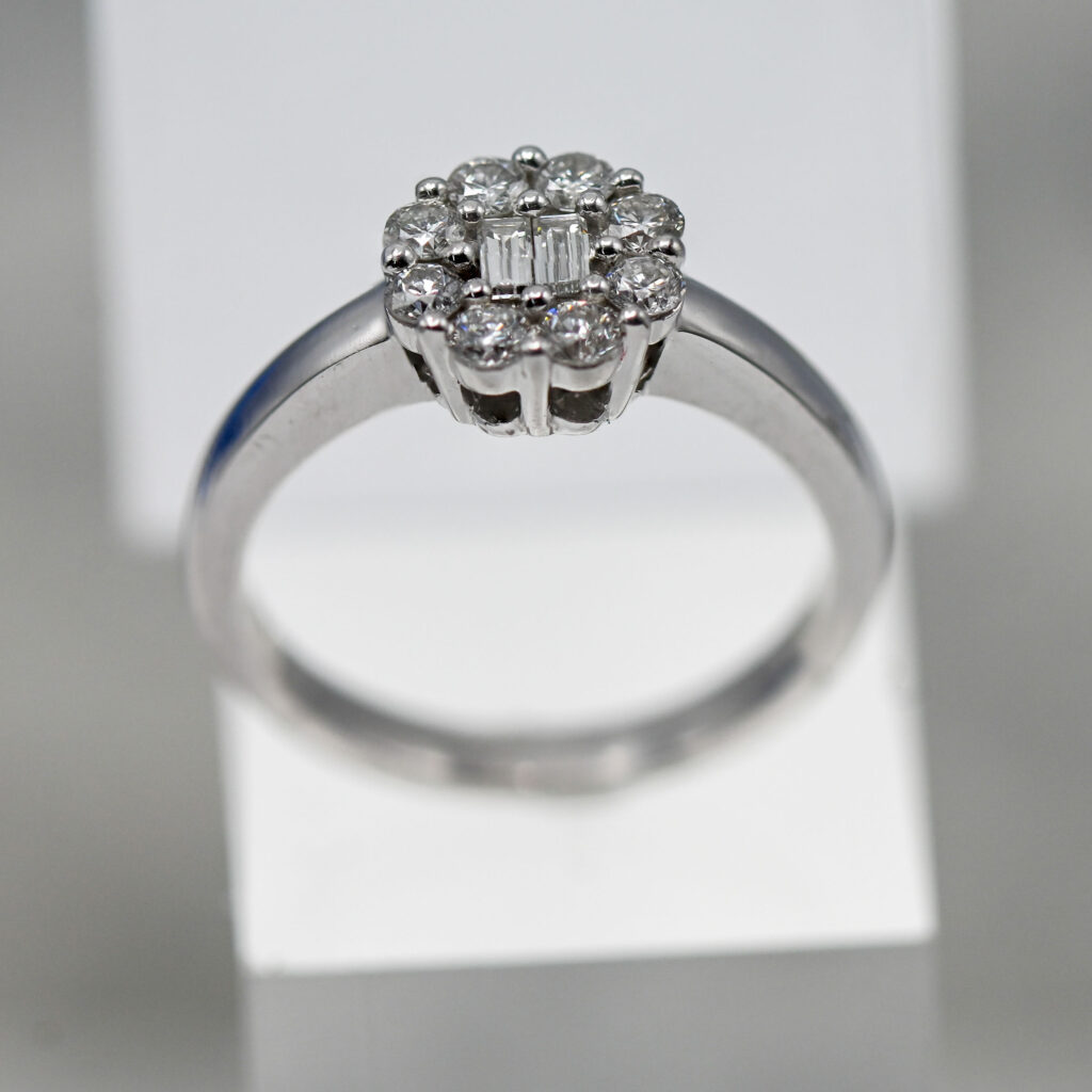 An 18ct white gold diamond cluster ring set with two small baguette cut diamonds to the centre, size L/M.