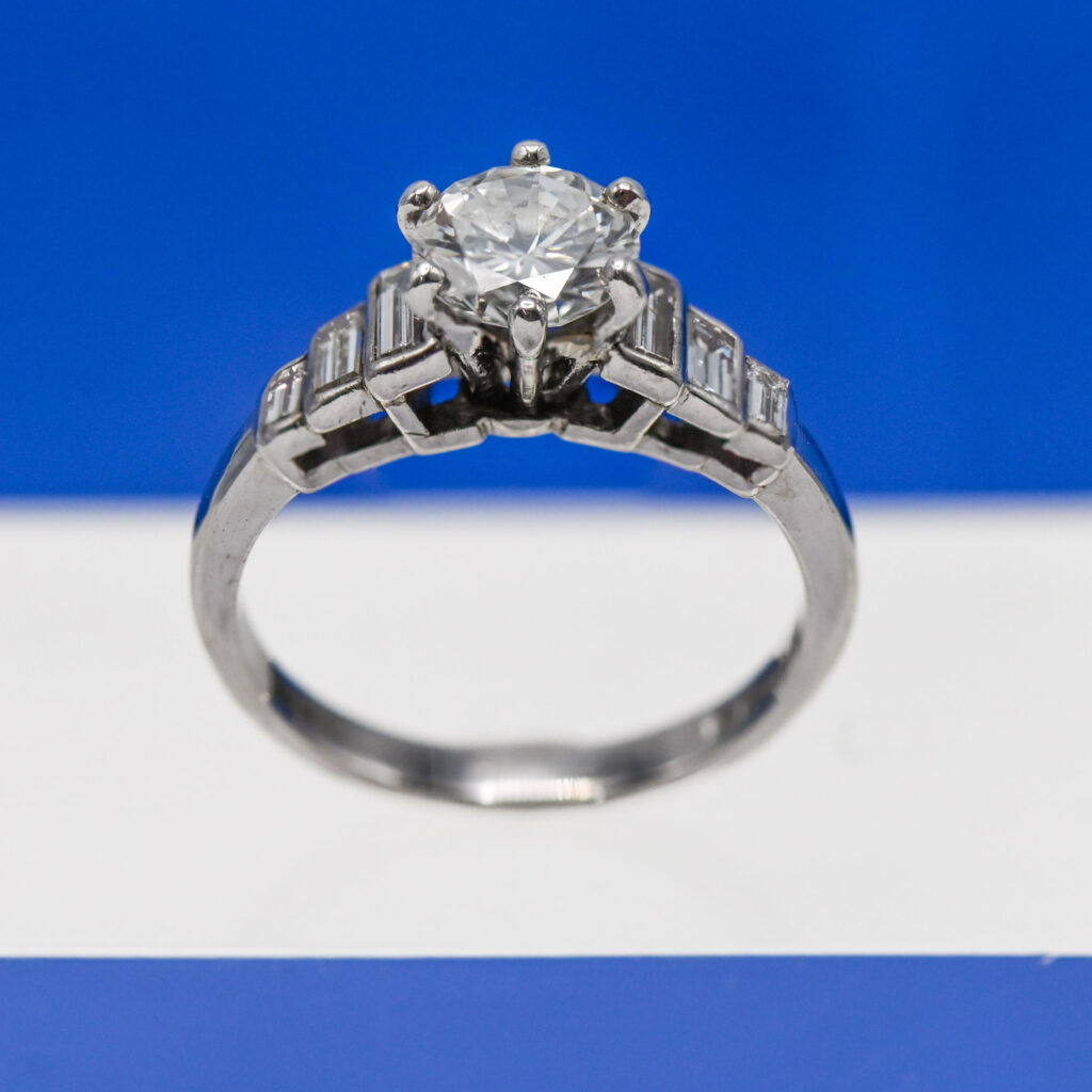 An 18ct white gold diamond solitaire ring set with baguette cut diamonds to the shoulders, approx 1.04ct, clarity Internally Flawless, colour F (1+), size K/L, with copy of Diamond Certificate.