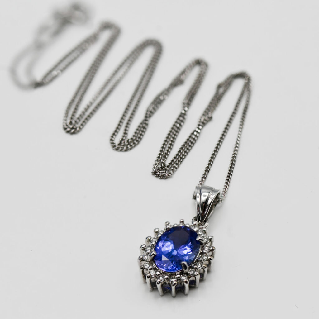 An 18ct diamond and tanzanite pendant set in white gold on a 9ct white gold chain, length of chain 45.5cm.