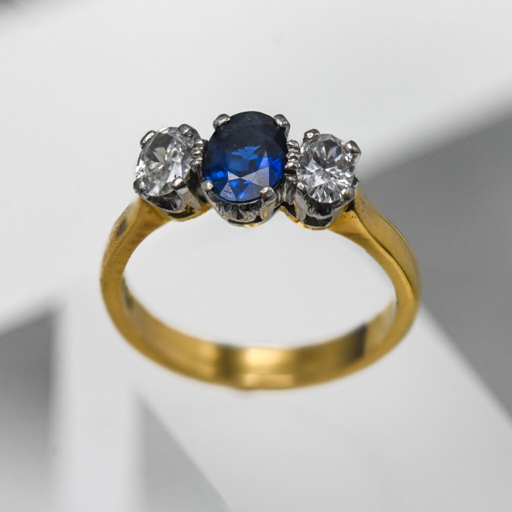 An 18ct yellow gold diamond and sapphire three stone ring, size N.