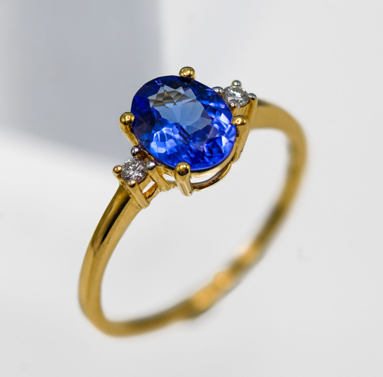 An 18ct yellow gold diamond and tanzanite three stone ring, size S.