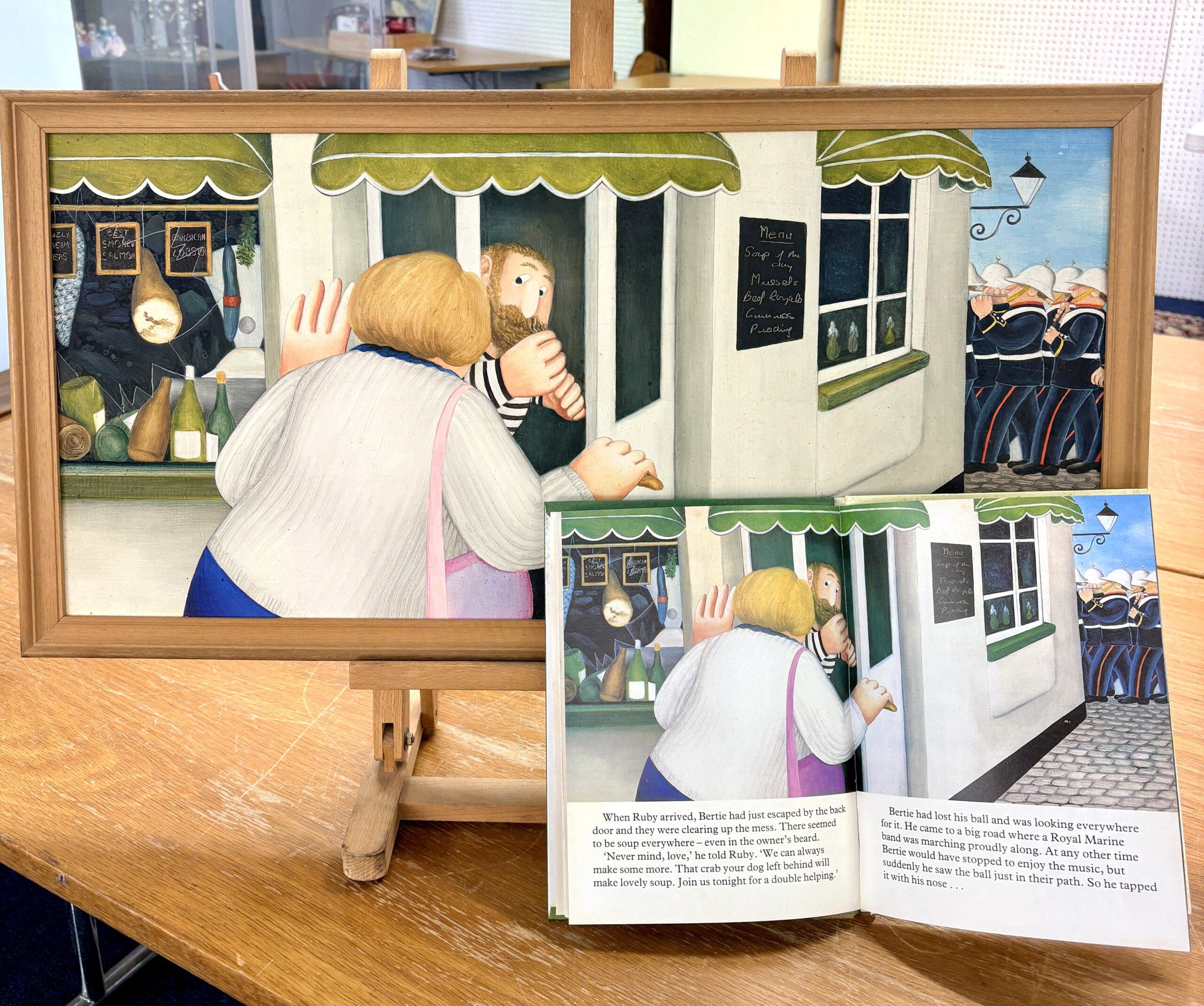 The second work, Broken Window, was featured in Cook’s 1980s children’s book Bertie and the Big Red Ball. The painting depicts a restaurant on Plymouth’s Barbican, Southside Street—then known as Piermasters. This work will form part of The Box exhibition before coming to auction following its public display.