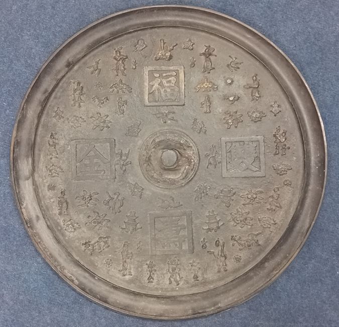 A cast iron roundel, decorated with Chinese characters and figures
