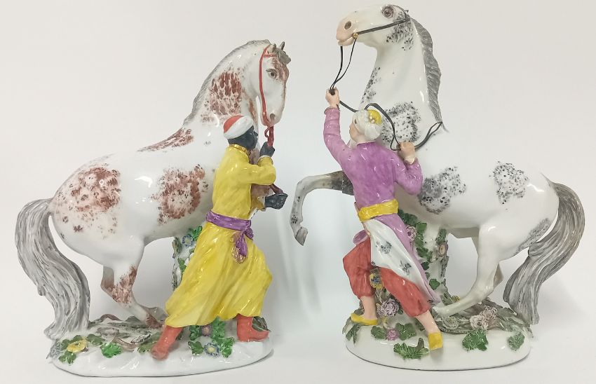 A pair of Meissen J J Kändler style groups of Stallions and Grooms, mid 18th century