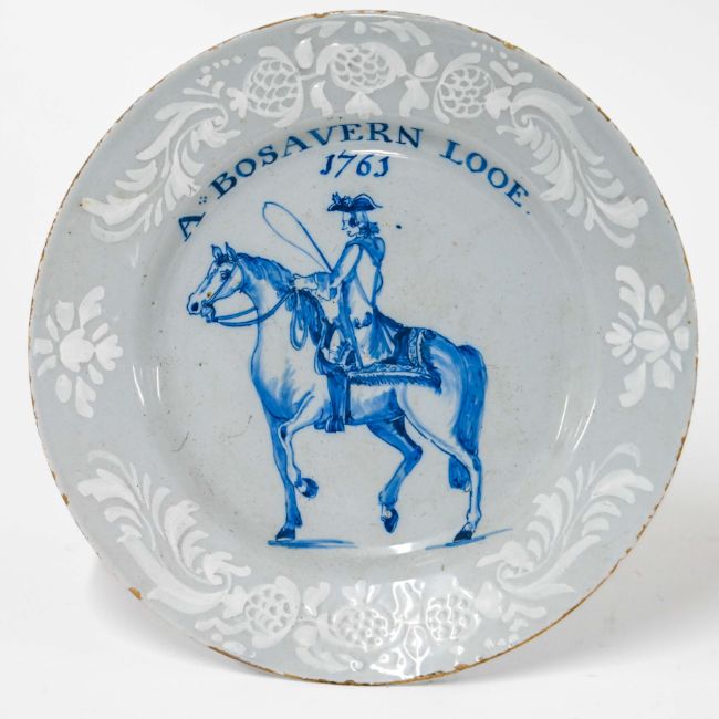 An 18th century Bristol Delft bianco sopra bianco plate, decorated with man on horseback inscribed ‘A Bosavern Looe, 1763’, diameter 23cm.